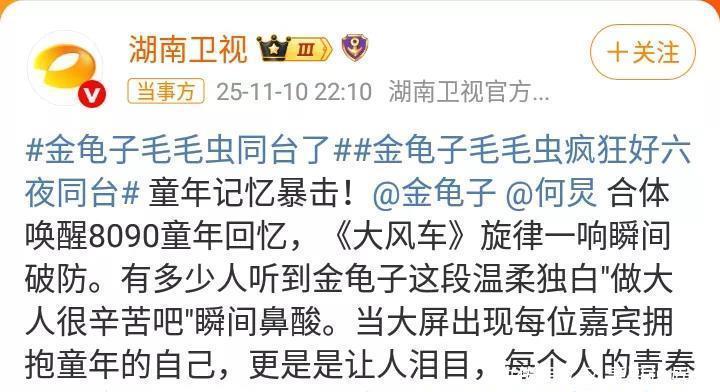 何炅金龟子同台演出,成湖南卫视双11好六夜演出的美好舞台!何炅看上去好年轻!金龟子的造型,令人回味无穷!在舞台之上,主持人何炅和曾经央视少儿节目主持人金龟子,一起同台再唱《大风车》主题曲!