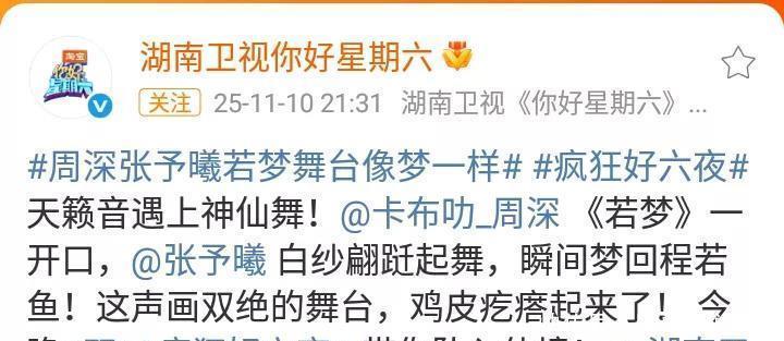 周深张予曦双11疯狂好六夜演出,成湖南卫视舞台最强音!周深和张予曦同台搭档,配合默契,令人感动不已!优秀艺人亮相大舞台,可谓是棒极了!这是周深和张予曦一起表演的《若梦》,歌舞升平,其乐融融! 周深工作室在上海发文,在字里行间带来了周深参与湖南卫视演出的好消息!在双11疯狂好六夜演出中,周深一共表演了两个节目。从《若梦》到《小美满》,歌手周深展现了艺人的美好与祝福!周深工作室在发文下方,公开了歌手周深九宫格演出照!每一张照片的呈现,彰显了优秀歌手的舞台风采!一年一度双十一,歌手周深在演艺圈内的发展越来越美好!祝福歌手周深!